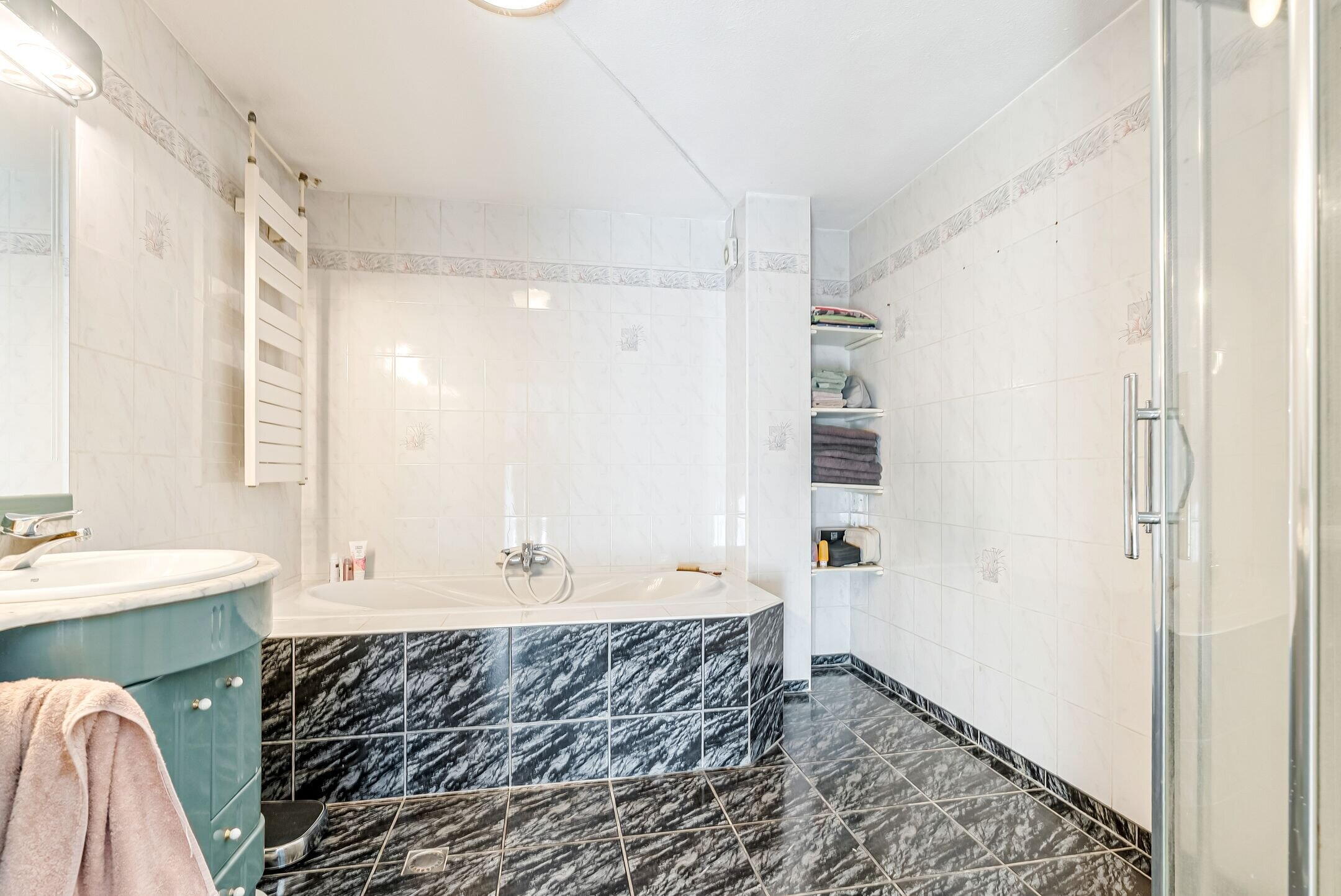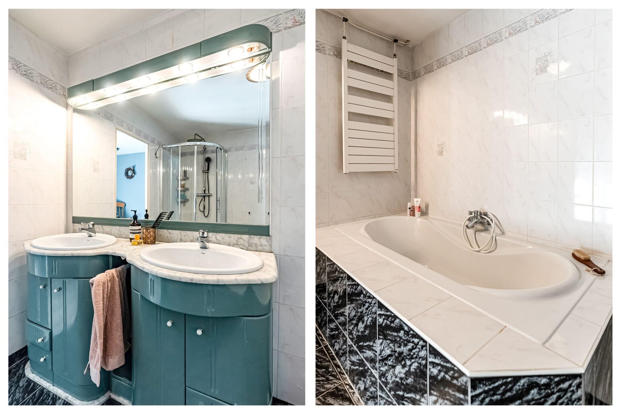 - Douche, dubbele wastafel, ligbad, en wastafelmeubel